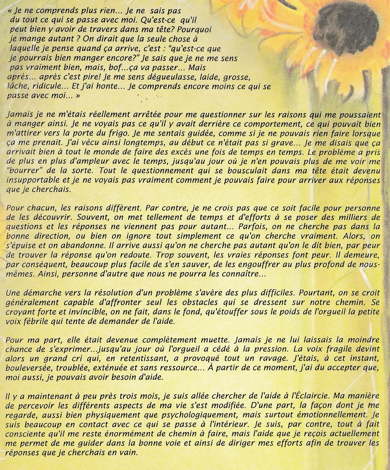 C’est pourquoi j’ai décidé de publier le témoignage que j’ai écrit à 21 ans pour la Maison l’Éclaircie, un organisme à Québec qui aide les gens qui souffrent de troubles alimentaires.